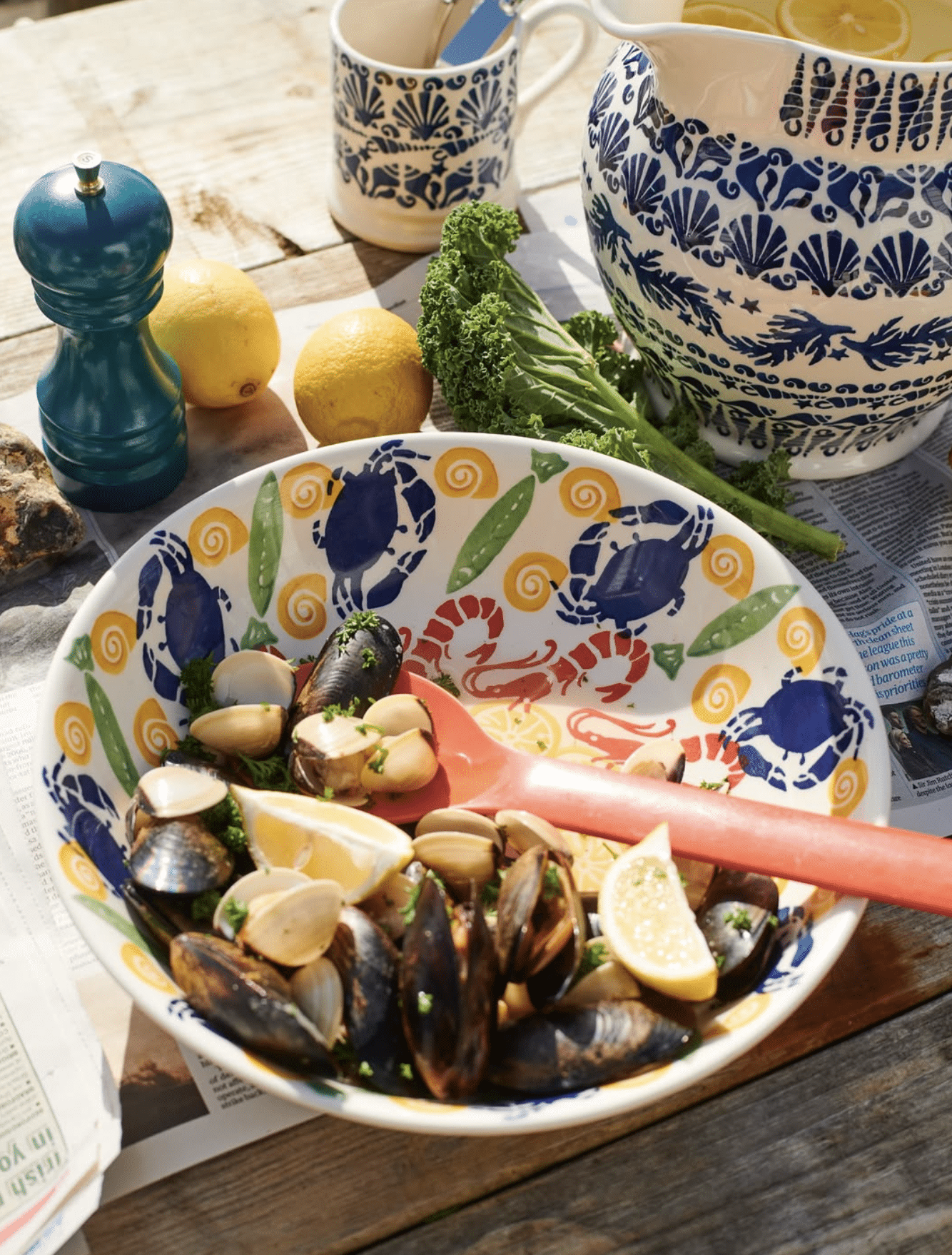 By the sea this beautiful bowl evokes the unchanging pleasures of beach huts, cockling, lollies, fish and chips, the show on the pier – and a huge great dish of Cromer crabs, whitebait, prawns shrimps with plenty of lemon squeezed over it- and mayo on the side – oh yes!