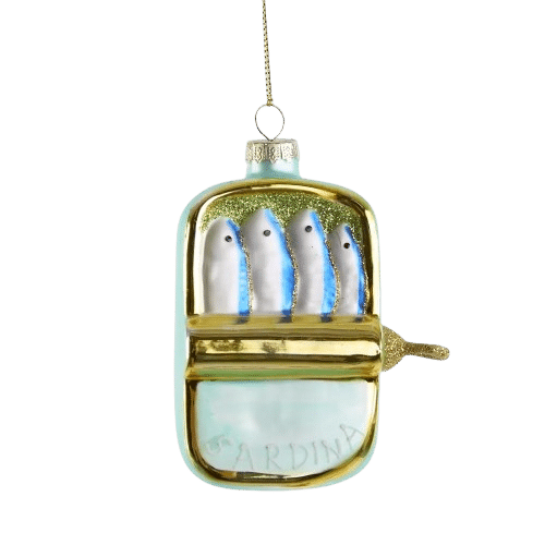 Brighten your holiday decor with this delightful glass Christmas decoration featuring cheerful Sardine tin!