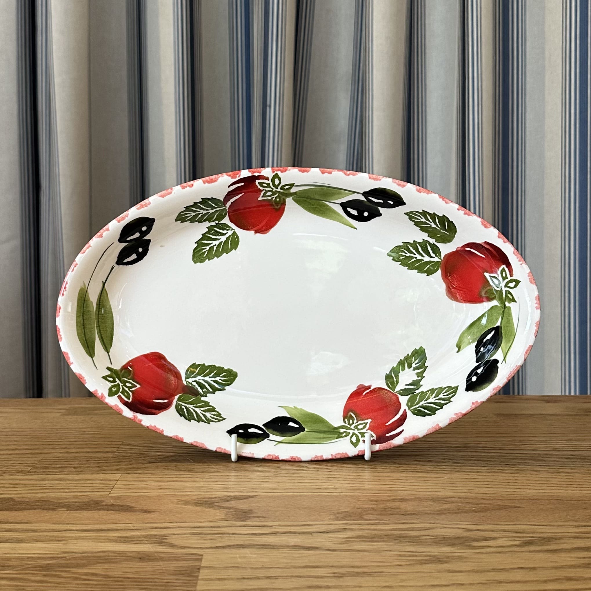 Experience the timeless charm of Italian craftsmanship with our exquisite Ceramic Tomato & Olive Platter, meticulously hand-painted to evoke the vibrant spirit of Italy. Each piece is a testament to the artisan’s skill, capturing the essence of Mediterranean elegance. Perfect for serving salads, displaying fresh fruits, or simply as a decorative accent, this bowl adds a touch of artisanal flair to any table setting or home decor. Elevate your dining experience and infuse your space with the allure of Italian living with our beautifully crafted Italian Tomato & Olive Platter.