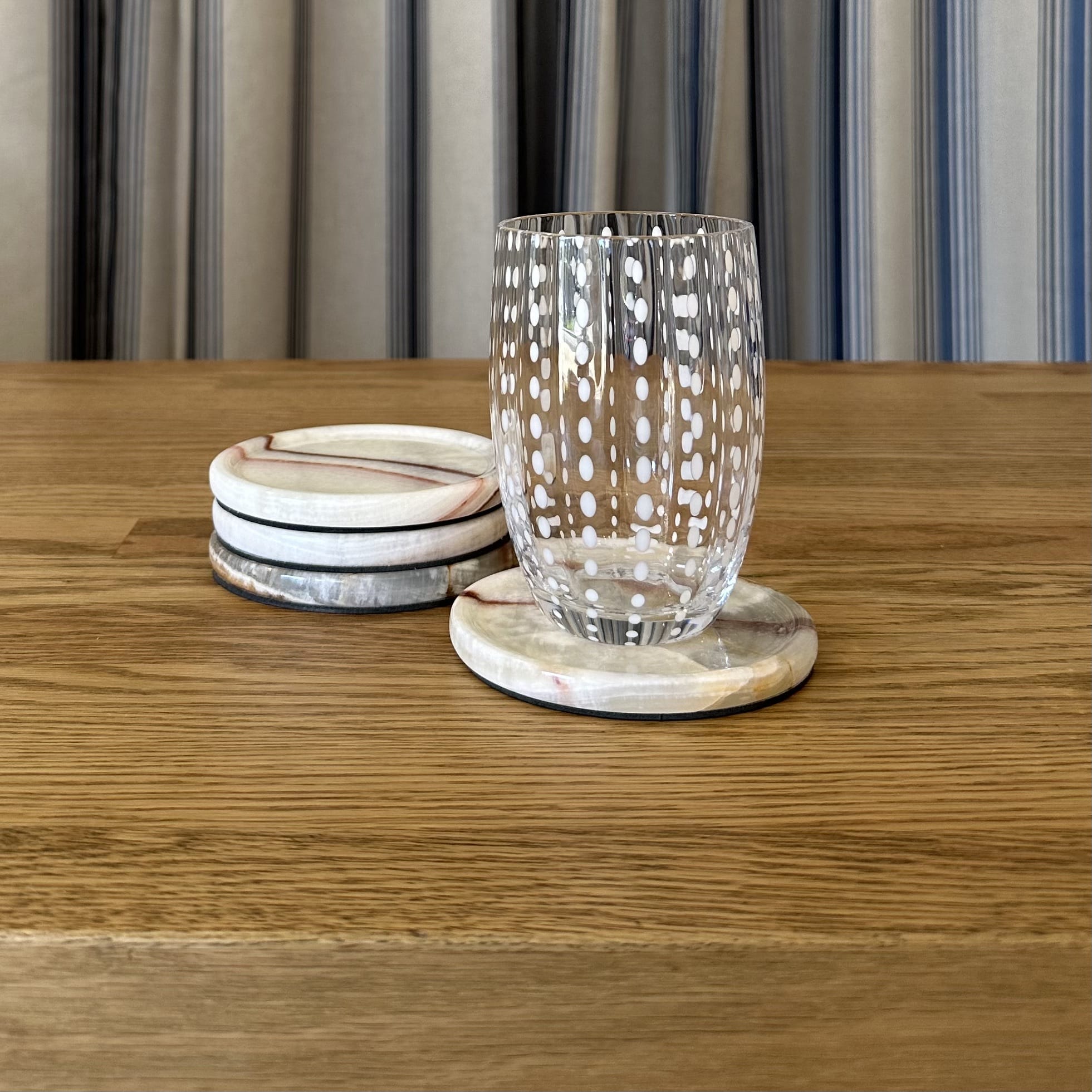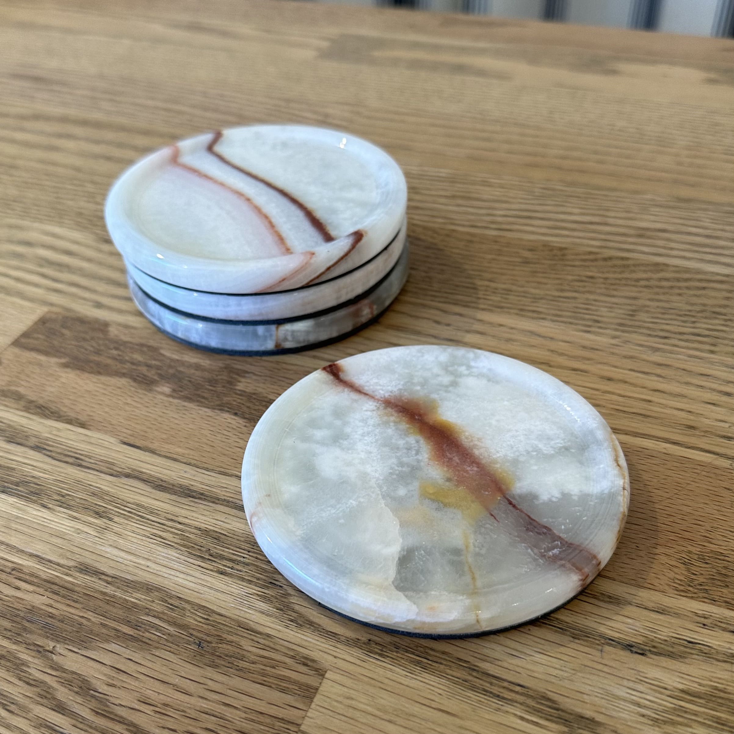 Crafted from natural white onyx, these stunning coasters are a true testament to the beauty of natural materials and the skilled craftsmanship that shapes them into timeless yet practical forms, perfect for everyday use.
