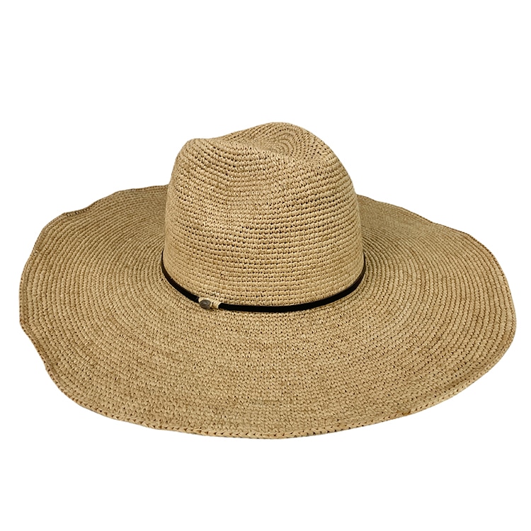 The must-have Aziz hat featuring a thin leather cord and delicate raffia plait details – With a 12 cm brim it’s adjustable and has a cotton inner band for added comfort – hand harvested, hand made and woven from durable, sustainably harvested raffia fibers