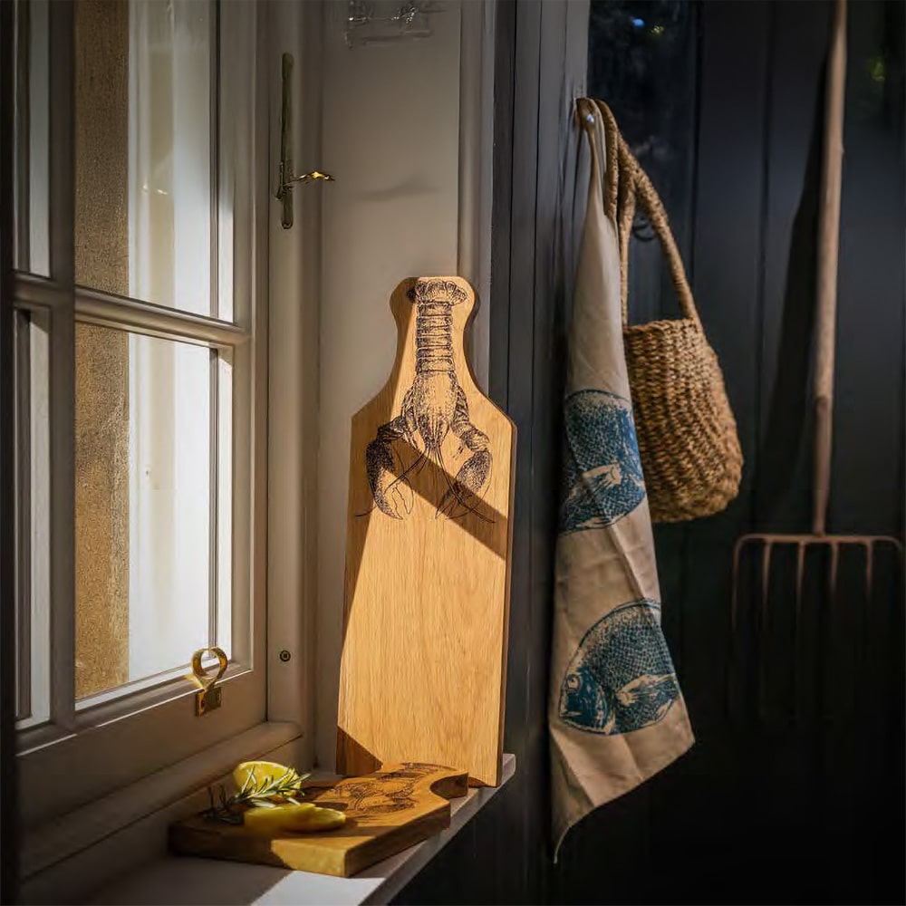 Add a touch of coastal flair to your kitchen with our Framed Oak Serving Board, showcasing an intricately engraved lobster design. Crafted and shaped to perfection, this board serves as an ideal canvas for serving and doubles as a distinctive decorative element in your kitchen space.